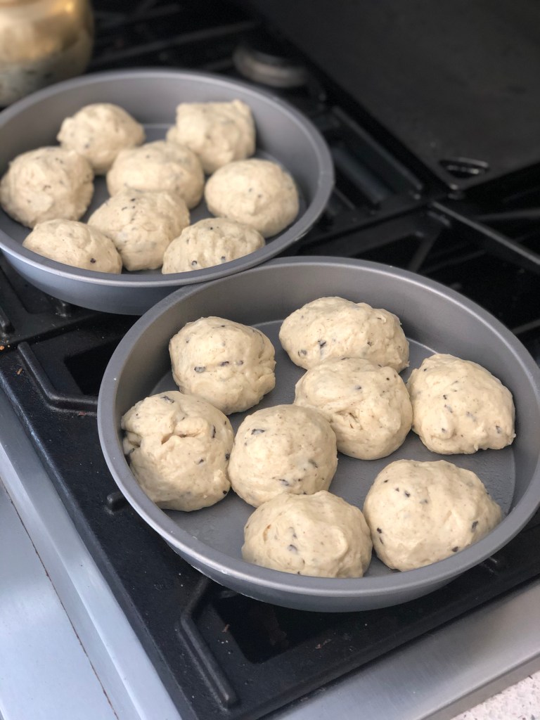 - Transfer the dough to a lightly greased work surface, gently deflate it, and divide into 16 pieces or 15 pieces. Shape each piece into a ball, and place 8 balls in each of the round pans OR place 15 balls in the rectangular pan in 3 rows of 5. King Arthur claims that “if you space the balls evenly, they shouldn’t touch each other” but I don’t know how that magic is achieved in the round pans.