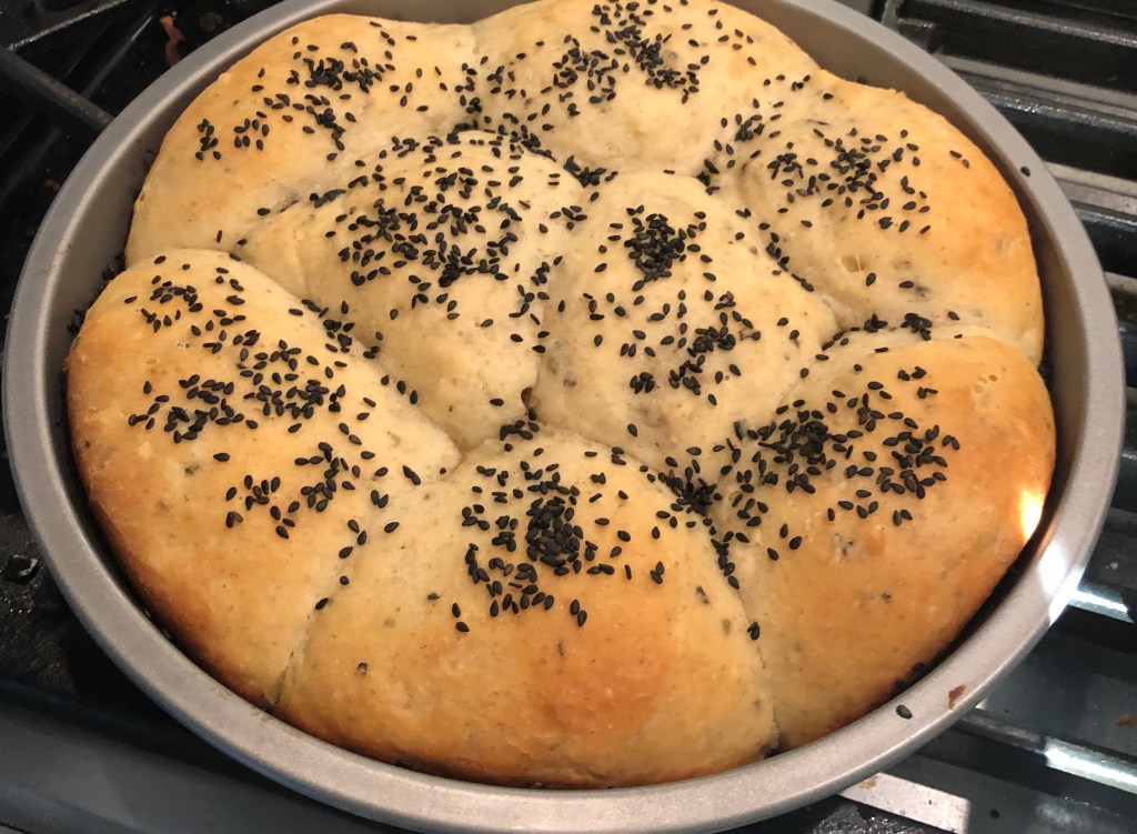 - Once the yeast is activated, add all of the remaining ingredients (except the sesame seeds) and mix with a dough hook until the lumps of butter are no longer visible. Turn the speed up to 4 (medium-low) and knead until the dough is soft and smooth. It will still be a bit tacky but should come away from the sides of the bowl easily.
