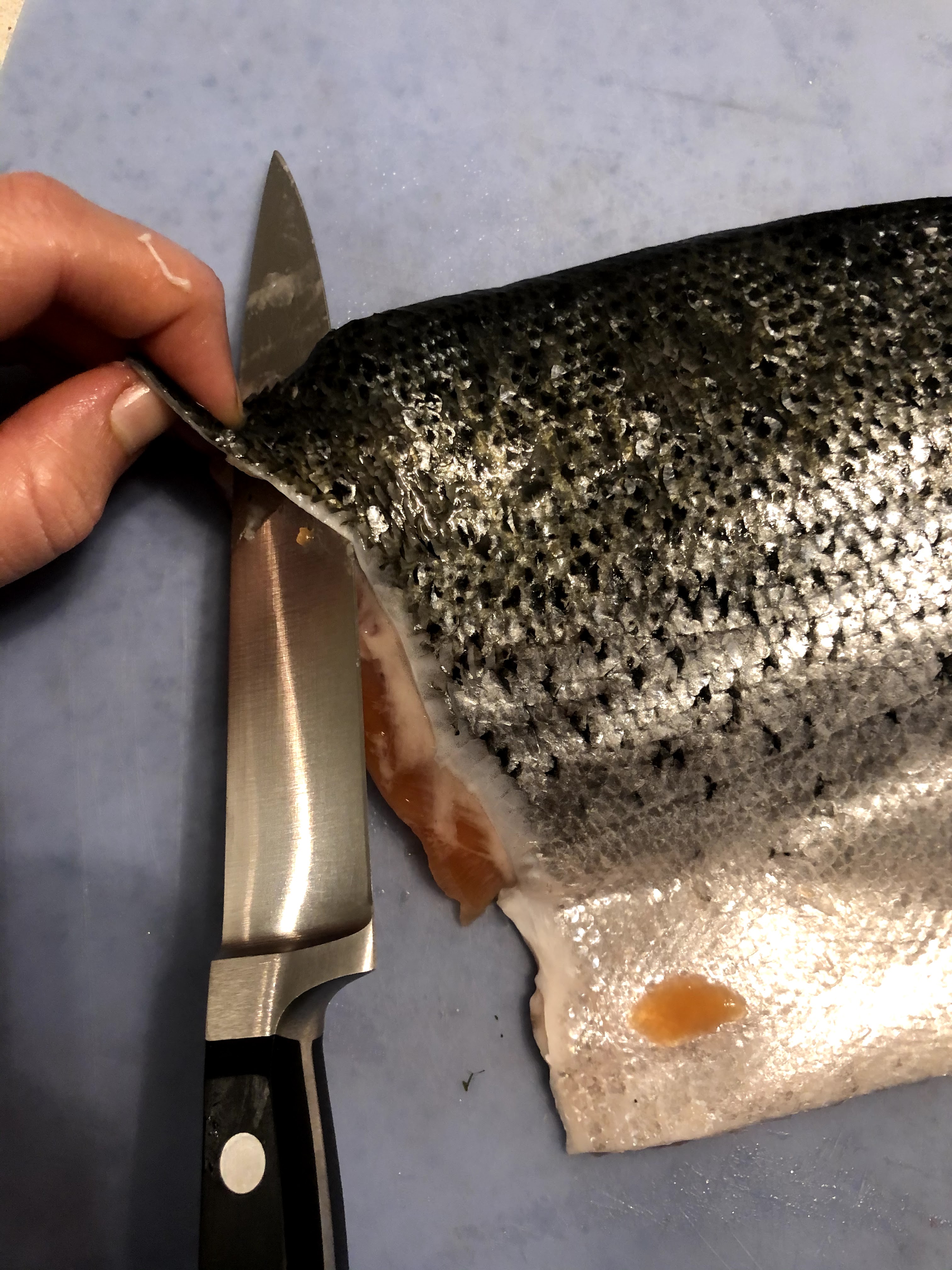 - If the salmon filets are not skinless, remove the skin. Turn the filets upside down. Make an initial first cut to free up a corner of the skin to grab onto, then use the knife to hold the salmon down while you pull off the skin. If you hit a part that’s more difficult, angle the knife up into the skin and with the hand holding the skin wiggle the salmon back and forth to make cuts right up against the skin. Set the salmon aside.