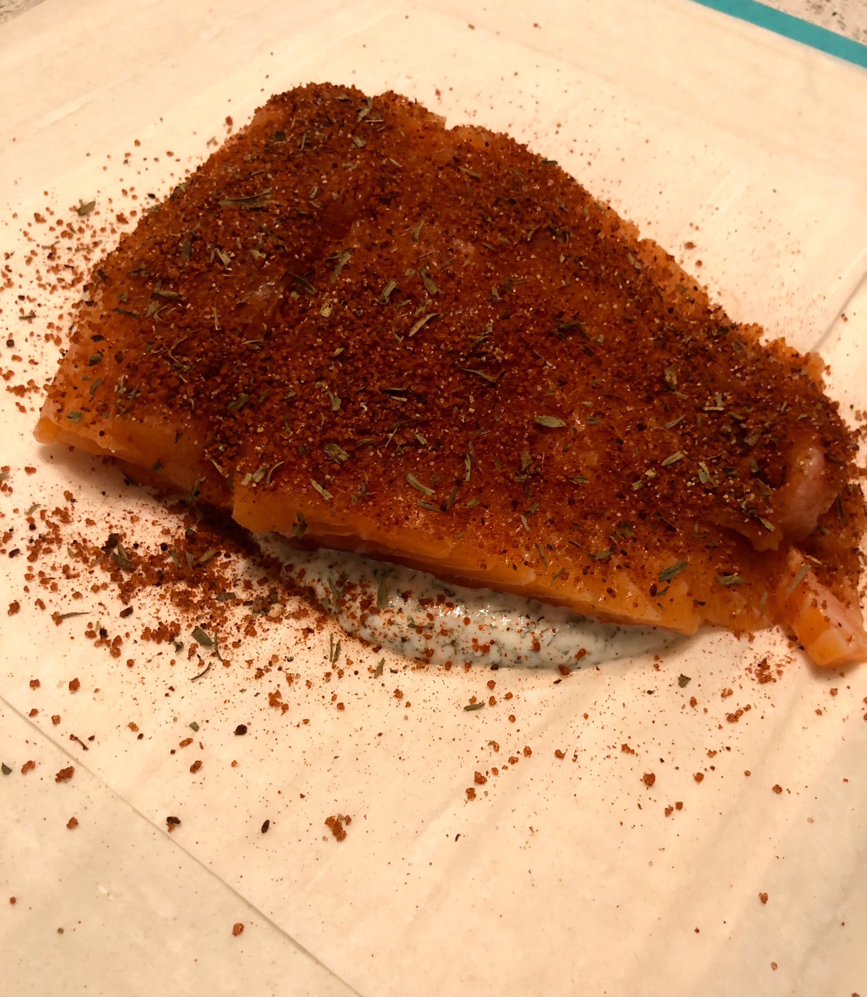 - For each filet, lay out 8 sheets of phyllo, alternating vertical and horizontal orientation. In the center dollop about half of the sauce. Place a filet on top of the sauce, then coat the top of the filet with the spice mix. If you don’t use all of the sauce or all of the spice mix that’s okay, different filets have different surface areas.
