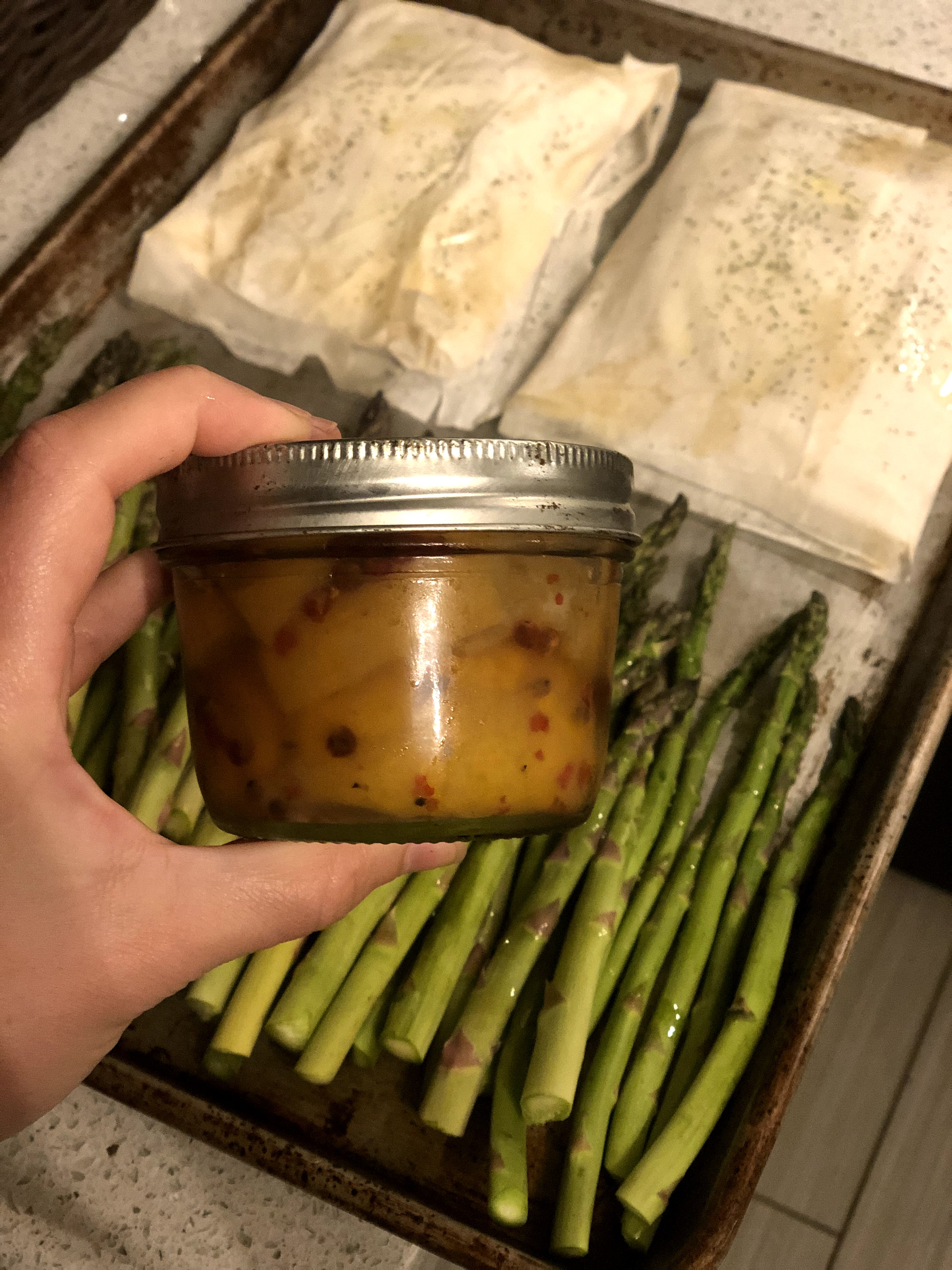 The hardest part of this recipe is skinning the salmon, but the benefit of wrapping it in phyllo is that if you totally butcher it and have to piece it back together, no one will ever know. And for the asparagus, if you don’t have preserved lemon just zest some lemon on before you throw it in the oven and hit it with a squeeze of lemon juice when it comes out. Preserved lemon also isn’t for everyone.
