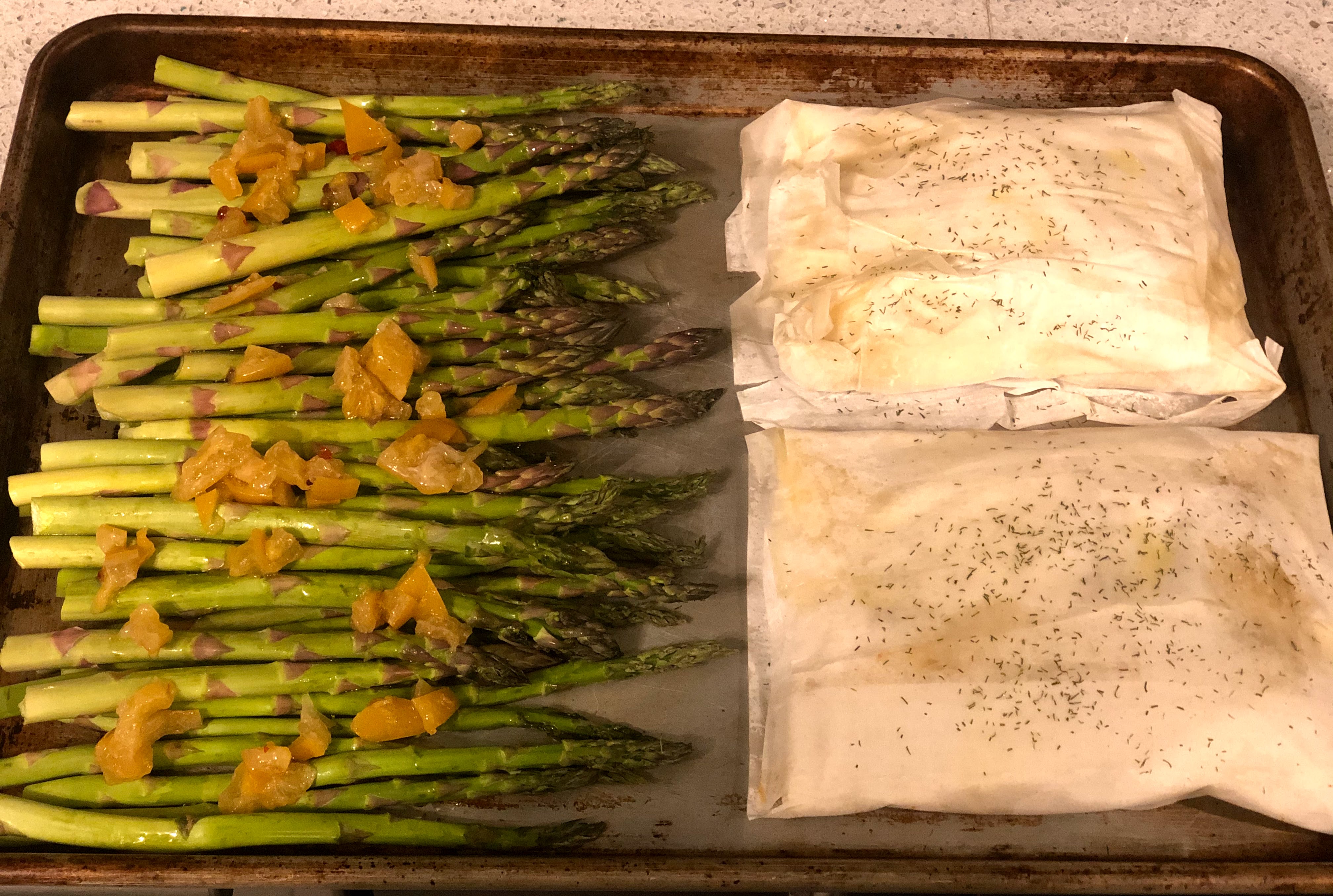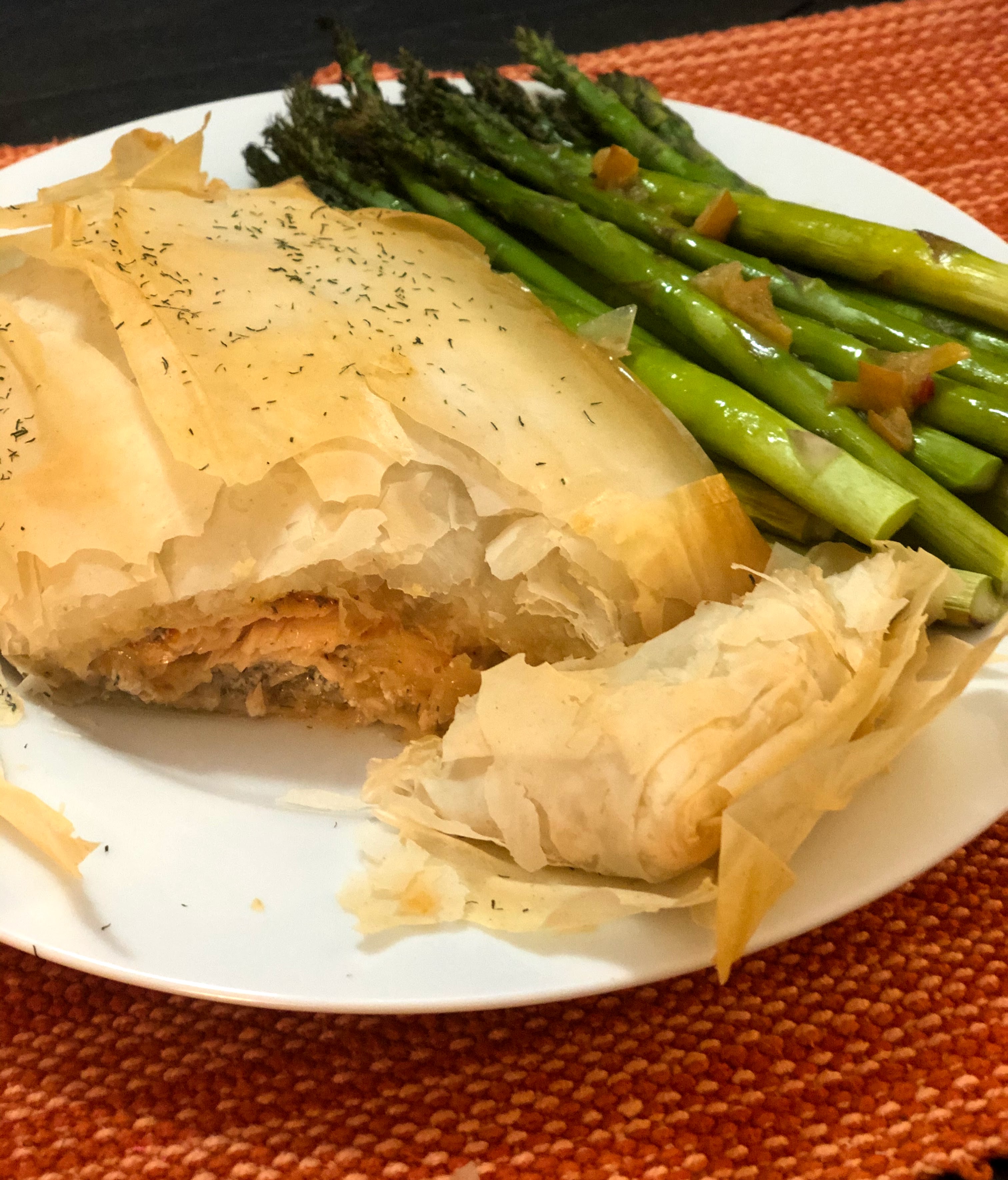 - Bake salmon and asparagus for 20 minutes, until phyllo is golden brown.