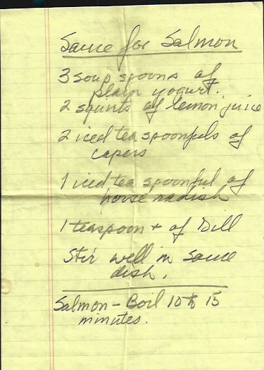 My dad has been making this sauce for so long that he gave the recipe to my grandparents, who are the only people to actually write it down, so it comes with all of their recipe writing idiosyncrasies. I myself don’t own an iced tea spoon and am not really sure what that is. The haphazard measurements run in the family though, as evidenced when I asked my dad for his salmon rub spice blend and he responded with “Mostly paprika, a good dose of thyme, and then less pepper.” It’s taken several tries to remember to actually measure everything, but it is also to your taste. I’m a big horseradish fan, so you may want to dial that back a bit. Although keep in mind when you taste the sauce that it will mellow out while it’s baking.