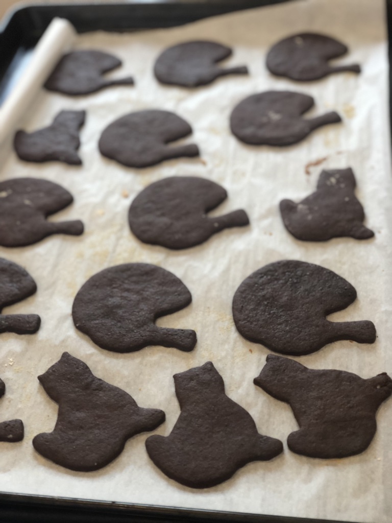 - When you’re ready to bake preheat the oven to 350. Break pieces off of your disk of dough to roll out, leaving the rest in the fridge. Roll dough out a bit more than 1/8 inch thick, cut out shapes and arrange 1 inch apart on baking sheets. This is a delicate dough because of the almond flour so you’ll need to use a lot of flour for dusting. If the dough is still firm you can put it right in the oven, if it’s starting to soften refrigerate it for 30 minutes before baking.