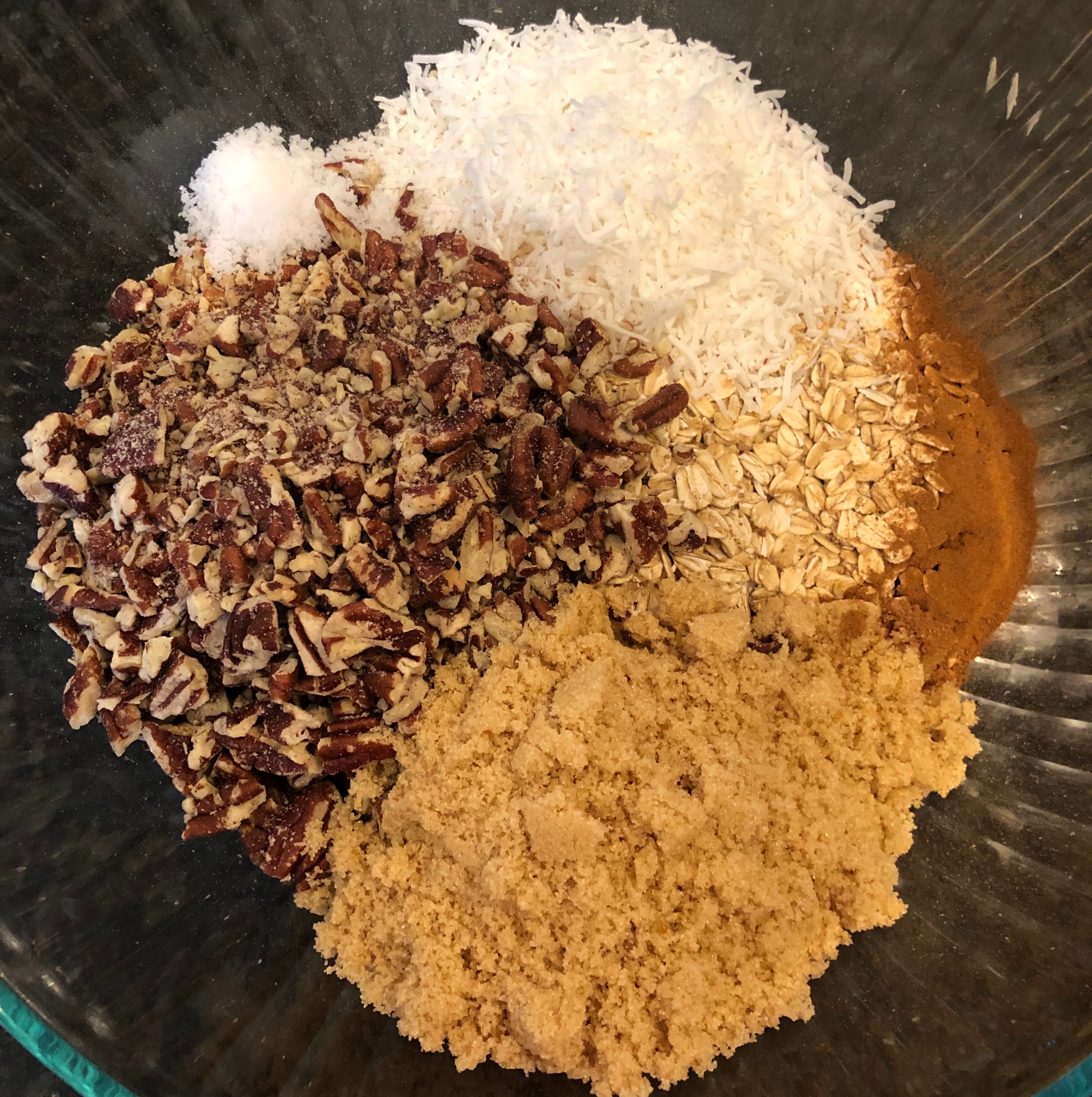 - In a large bowl combine the oats, nuts, coconut, sugar, salt and spices. Mix until the sugar is evenly distributed.