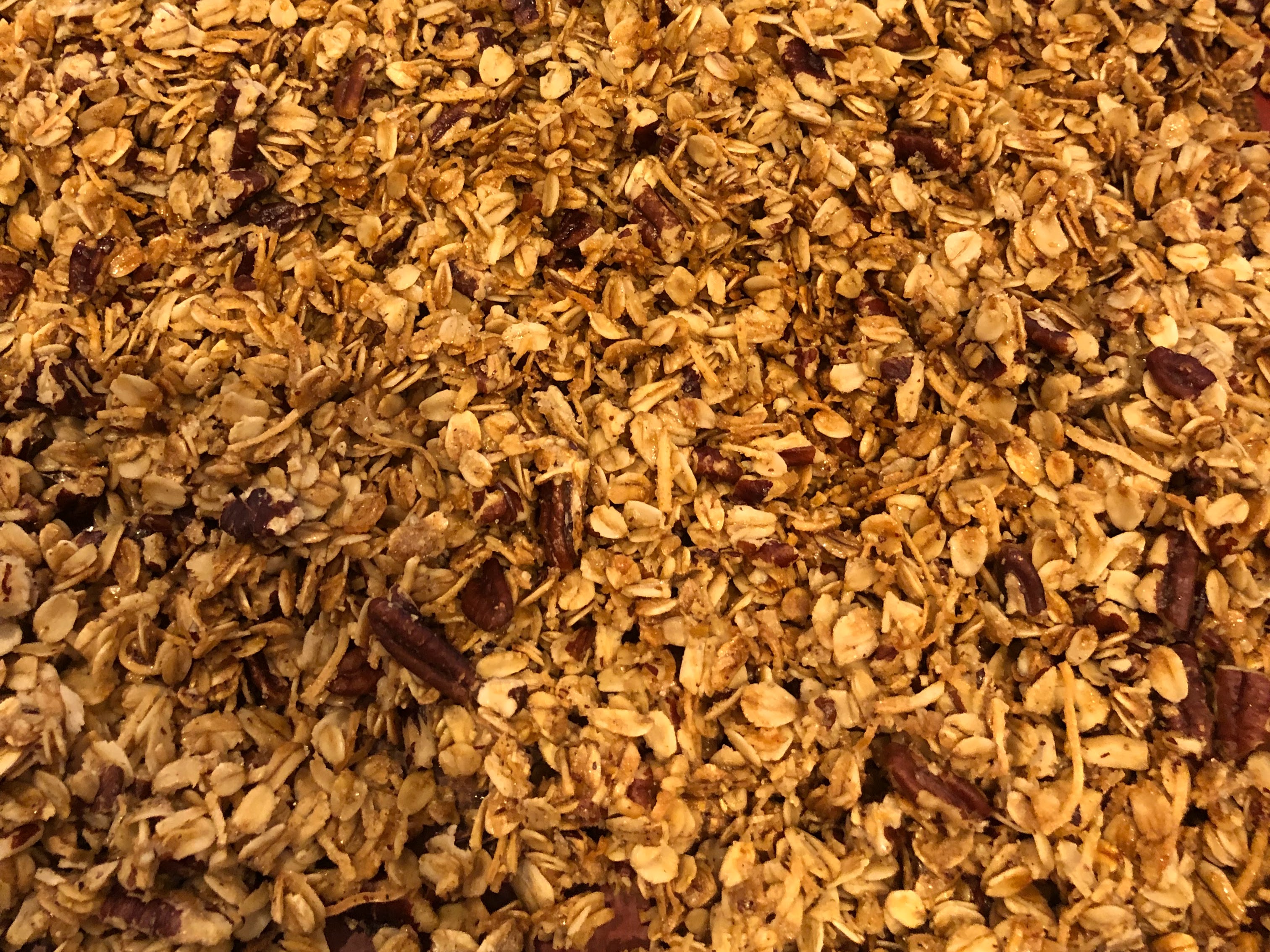 - In a liquid measuring cup combine maple syrup and oil. Pour into bowl and combine. Mix until the sugar is fully dissolved and all the oats look coated in liquid. Pour onto a half sheet pan and spread evenly. Bake for an hour 45 minutes, stirring every 15-30 minutes. If you want the big chunks of granola stir less frequently, if you want it broken up stir more frequently.