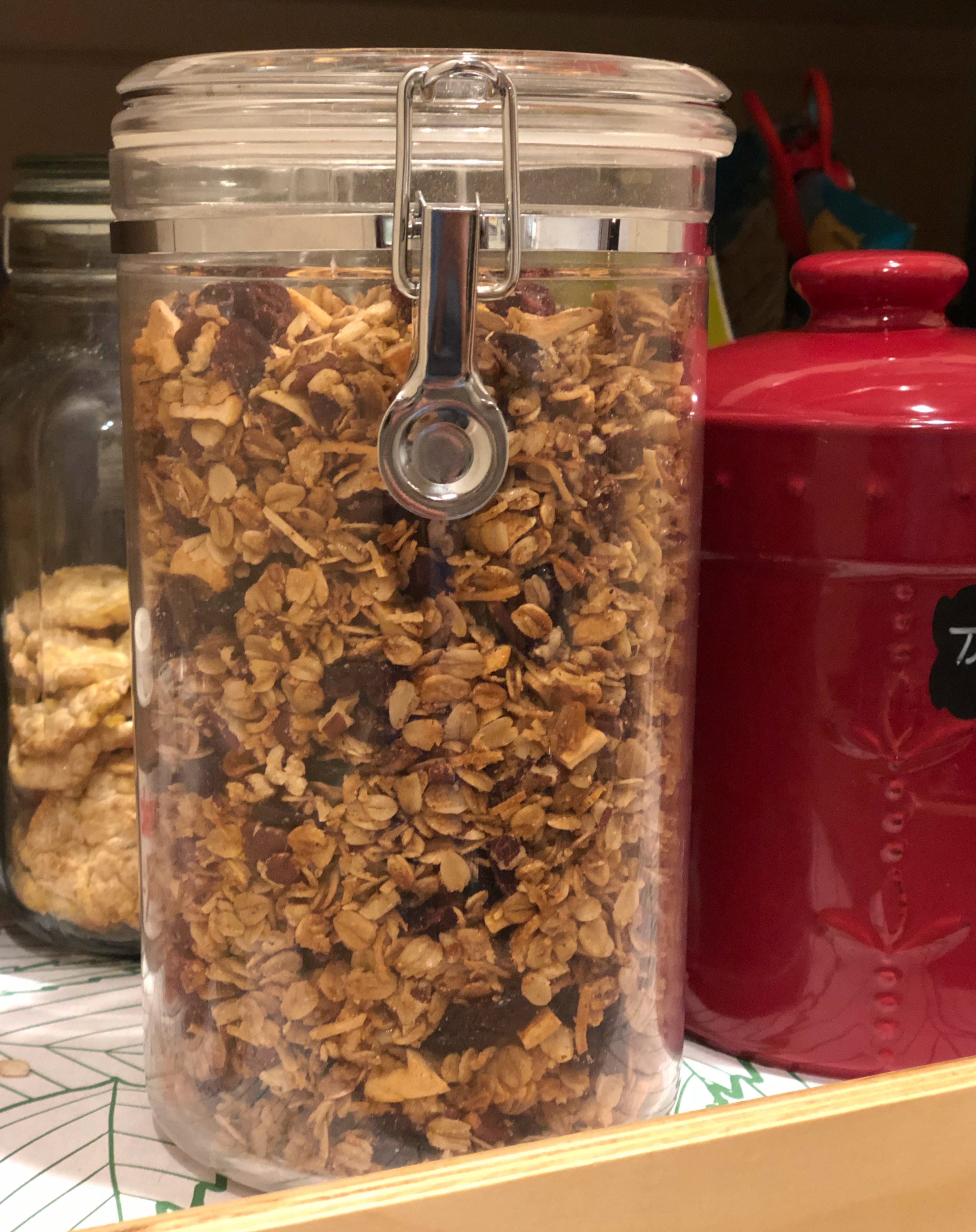 For a snack that’s honestly pretty expensive, granola is easy to make. It just takes some time to bake but you can mix and match the basic flavors, dried fruits and nuts to make your own mix. This one is vaguely apple pie flavored.