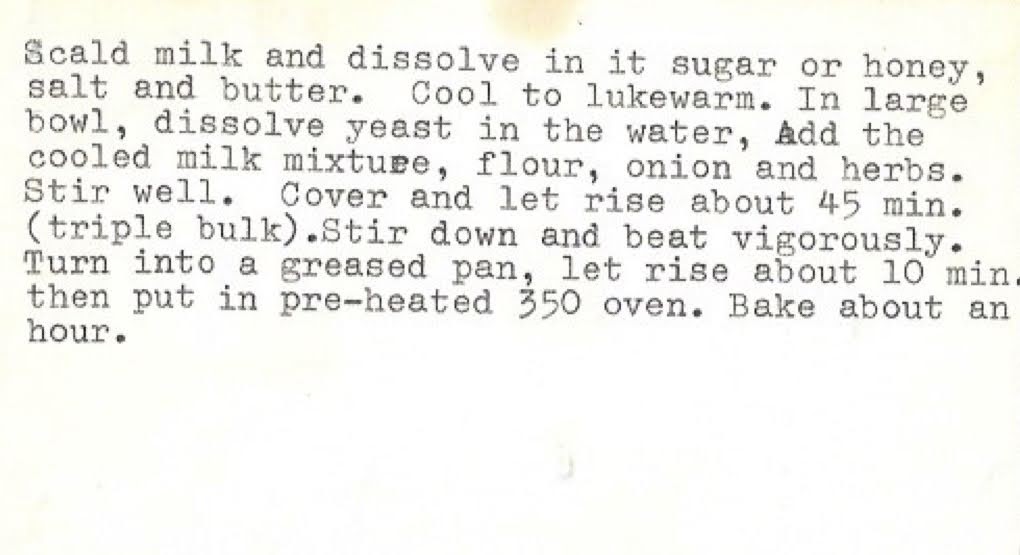 Scald milk and dissolve in it sugar or honey, salt and butter. Cool to lukewarm. In large bowl, dissolve yeast in the water. Add the cooled milk mixture, flour, onion and herbs. Stir well. Cover and let rise about 45 minutes (triple bulk). Stir down and beat vigorously. Turn into a greased pan, let rise about 10 minutes then put into a preheated 350 degree oven. Bake about an hour.