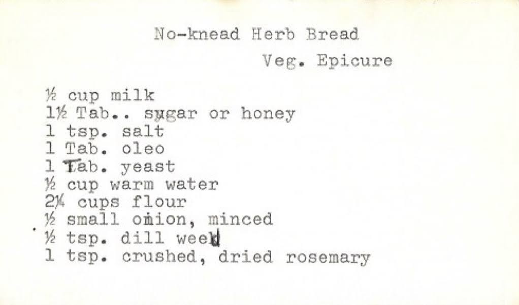All of my grandma’s bread recipes have been pretty solid so far. The major exception is Quick French Bread which I haven’t posted yet because I’m struggling with making it a working recipe while retaining the essence of it. It’s just a terrible recipe. The first thing that jumps out about this recipe is the oleo. If you look at the description you can see it’s supposed to be butter but someone tried to make a “healthy” substitution. It also just says “yeast.” Given that there’s no waiting time, I went with instant yeast. The other change I was planning on in advance was the herbs. I think in the spirit of freshly baked herb bread and Vermont, fresh herbs are the move.