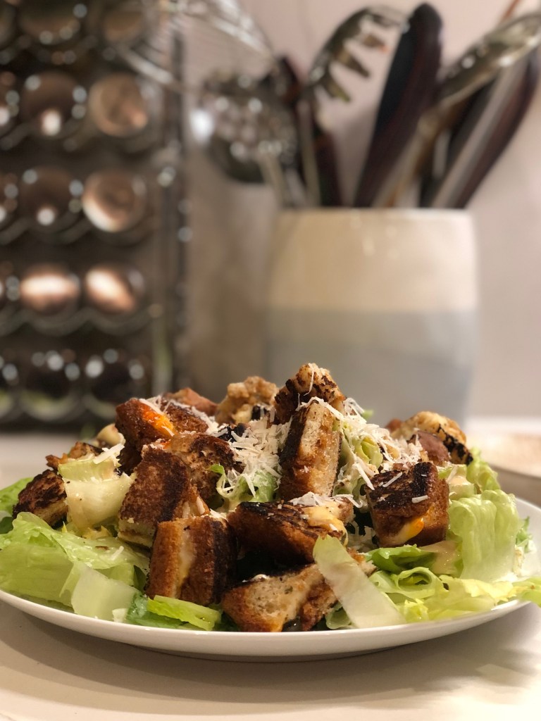 This recipe appears very simple and part of that is that it doesn’t fully explain the steps. Also the order of a few things bothered me. I added the flour before the milk mixture just to protect the yeast from the heat in case it isn’t actually cooled. Technically water should be before yeast in the ingredient list since it’s mentioned in the instructions first so I made that switch. I changed the onion to a shallot because I do remember how small a small onion was in Eastern Vermont in the 90s and I hate to play into the whole “Everything is bigger in Texas” trope but the onions definitely are. Finally you’ll notice I added a fair amount of flour. When you make this you’ll see what a wet dough it is even with this addition; in the first iteration it was more of a batter than a dough. Way too soft and difficult to work with. This still makes a super soft dough but now it’s got enough structure for sandwiches or what I did with it…grilled cheese croutons for a miso caesar salad.