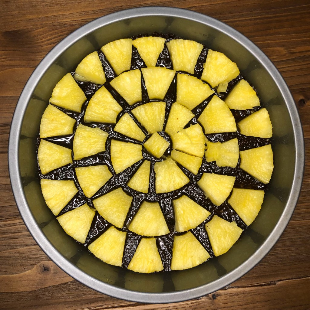 - Make the topping: In a small bowl mix together the brown sugar/jaggery, cinnamon and ginger. Melt the butter then pour it over the sugar mix and stir until it makes a paste. Spread across the bottom of your prepared pan, covering completely. Arrange pineapple in whatever fun design you like.