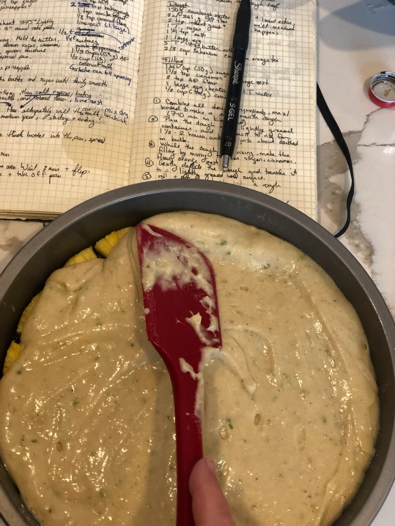 - Pour the thick batter into the cake pan (the pineapples should be well stuck in the cooled sugar/butter so they don’t shift under the batter). Spread to the edges and tap the pan on the counter to release air bubbles trapped between the pineapple pieces.