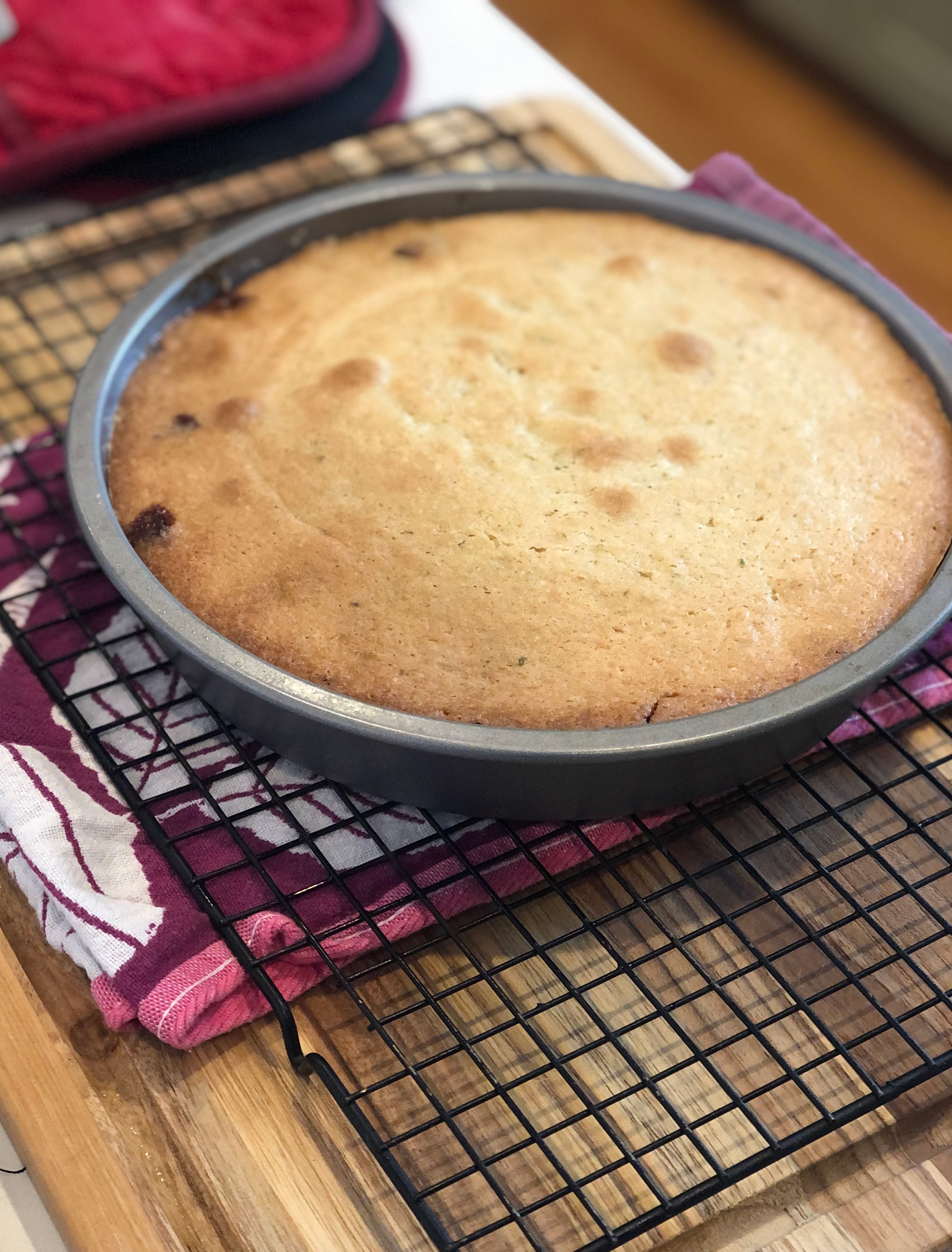 Flipping the cake is obviously the scariest part of any upside down dessert, but I think I’ve minimized the risk with my technique. To prepare to take the cake out of the oven lay a folded kitchen towel on the counter with a cooling rack on top. Have your serving plate to the side. When you take the cake out of the oven place it on the cooling rack. This way you can slide your hand under the kitchen towel and get a good base under the cake without dealing with hot pans or oven mitts. Put the plate upside down and flip. If you want to go the extra step I put the whole contraption on a large cutting board so I wouldn’t be bring the plate down on a hard counter but on a soft wooden surface.