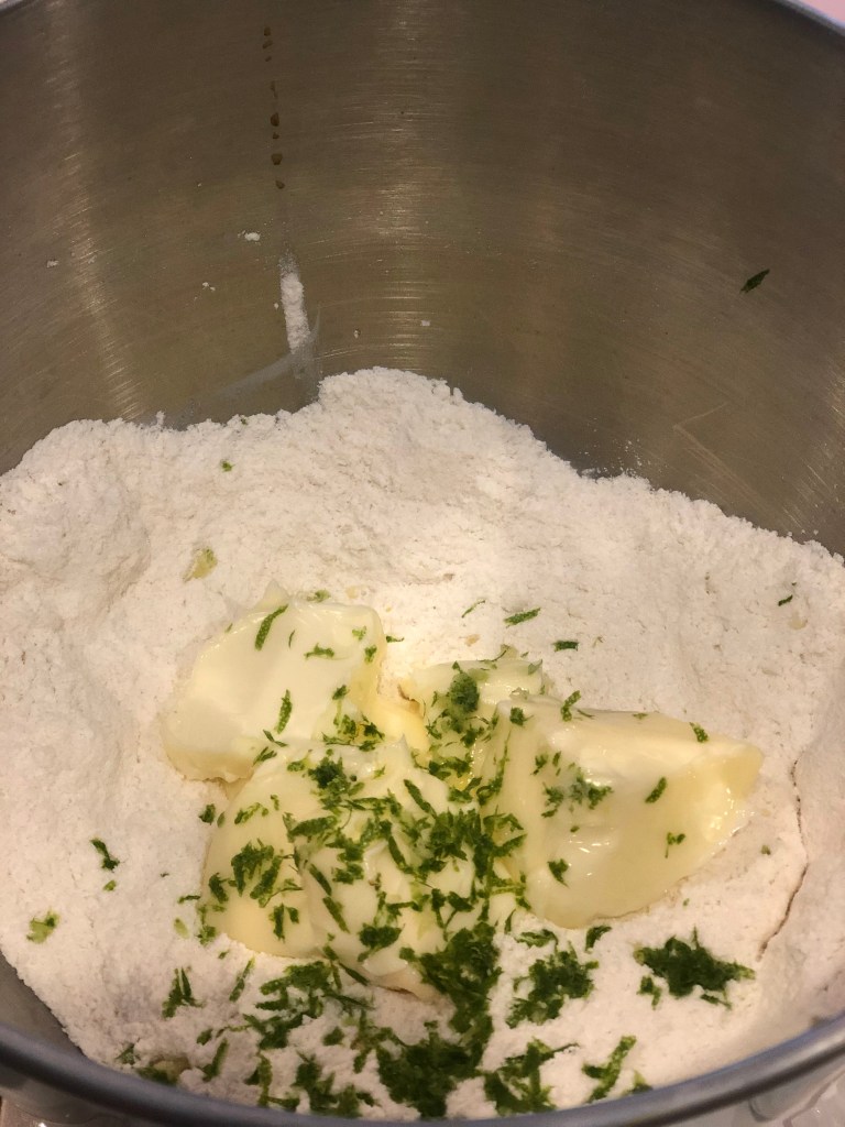 - In the bowl of a stand mixer or in a large mixing bowl combine dry ingredients (including sugar). Add the butter, lime zest and remaining sour cream. Mix on low speed until flour is coated in the fat. Increase to medium speed (high speed for a hand mixer) and beat for 2 minutes. Scrape down the sides and add the egg mixture in 3 batches, beating for 20 seconds or so after each addition. Scrape down the sides and give it a final mix.
