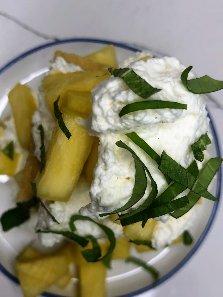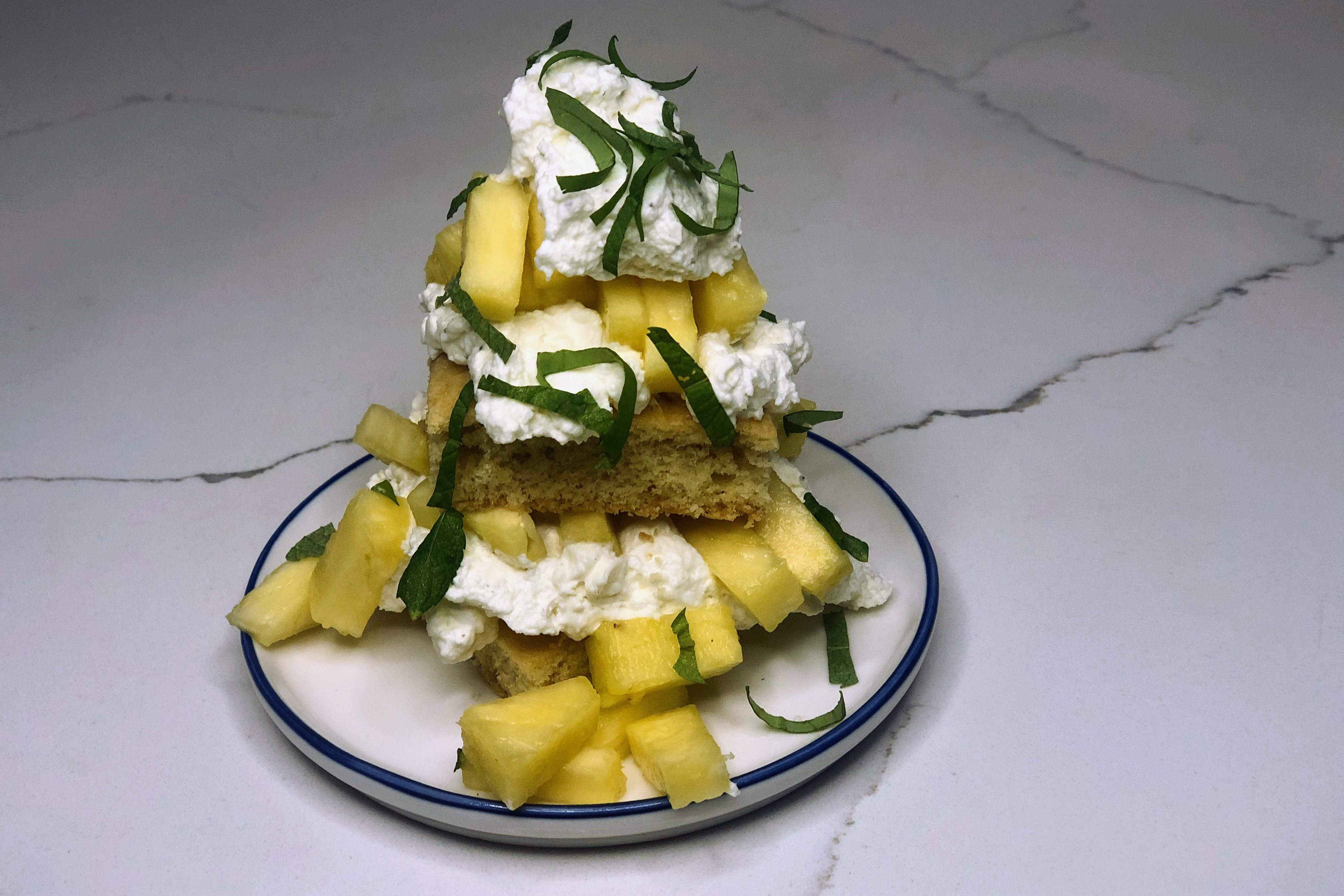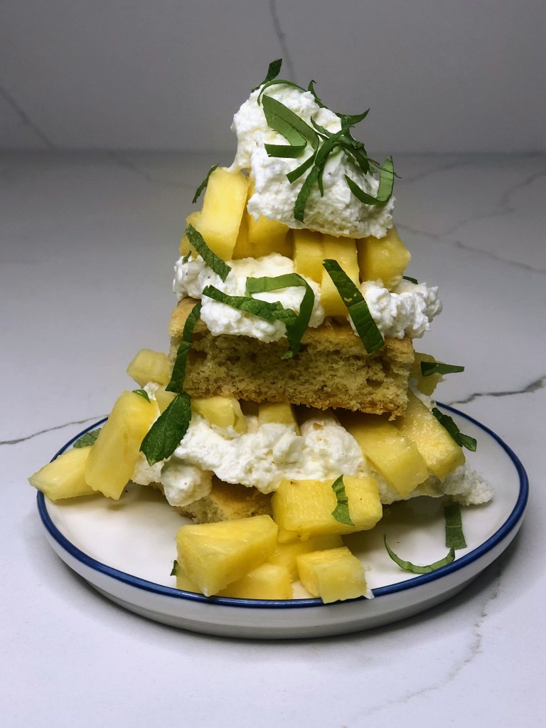 - To assemble a single cake, when everything is cooled, stack cake, whipped cream, pineapples, cake, a thin layer of whipped cream, pineapples and dollops of whipped cream. For smaller cakes cut sponges into squares before stacking. Garnish with fresh mint or basil if you like.