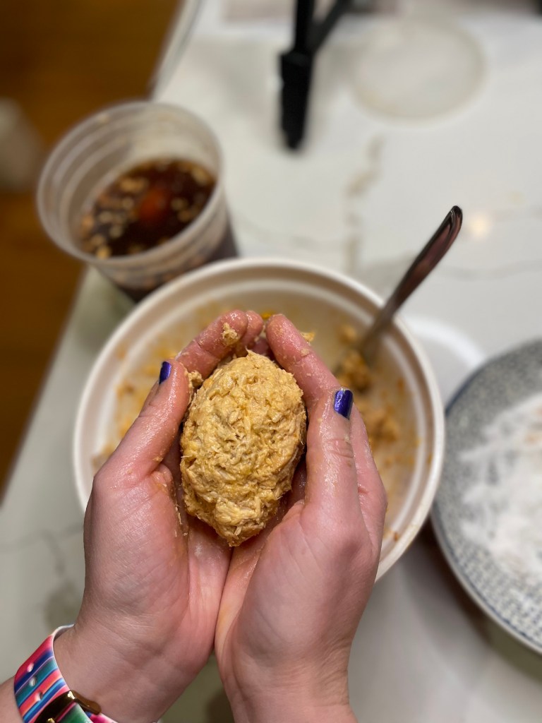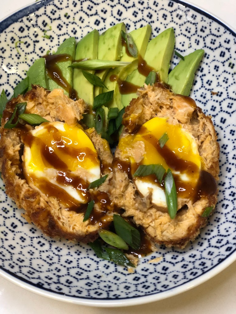 It’s unfortunate that I came up with this recipe so early in my life, because I know this is my greatest invention and it’s hard to know that I’ve now peaked. It’s all downhill from here because how could I possibly top combining ramen eggs, spicy salmon, and what I guess is a highlight of British cuisine, the scotch egg.