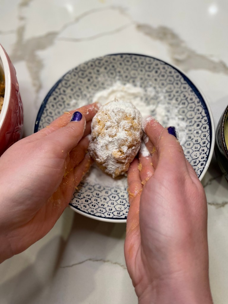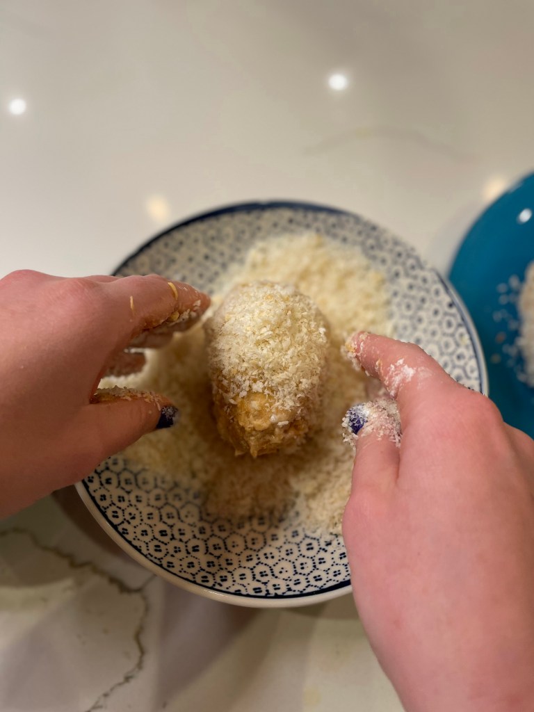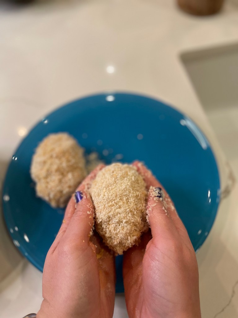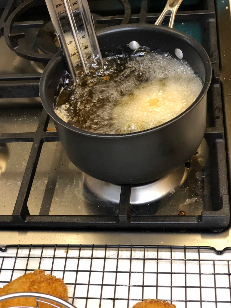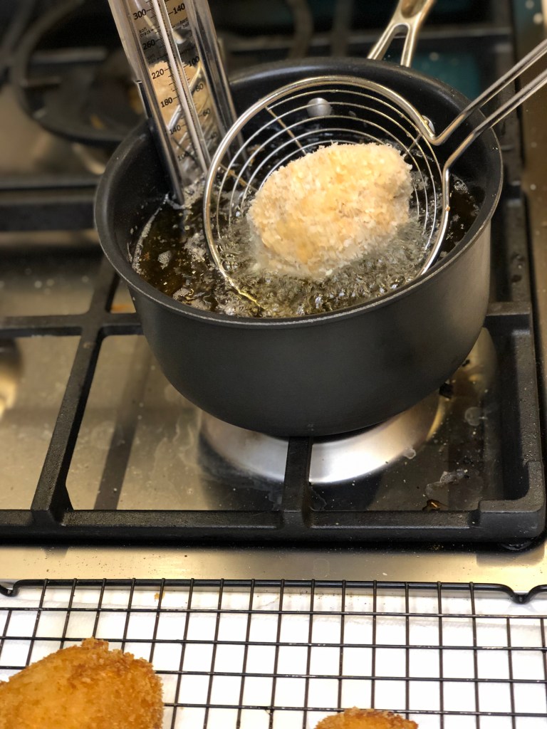 - Set up your dredging stations; in order your eggs, bowl of salmon, rice flour, egg wash, panko. In a heavy bottomed saucepan bring enough vegetable oil to cover scotch eggs to between 350° and 375°F. If you don’t have a candy thermometer drop a panko crumb in and when it sizzles on contact the oil is ready. Set up a rack over paper towels to the side of the oil to remove eggs to after frying.