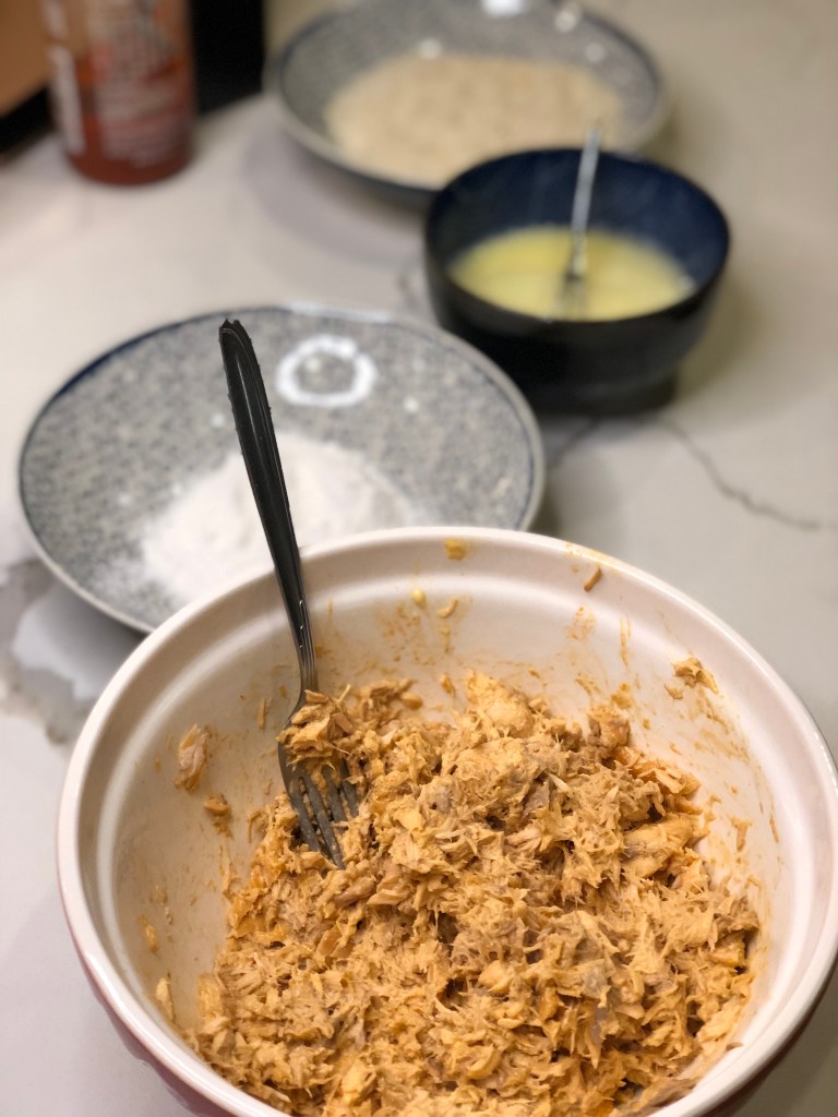 - Spicy Salmon: In a medium bowl use a fork to mix and mash spicy salmon ingredients until the texture is similar to sausage filling and everything is fully incorporated.