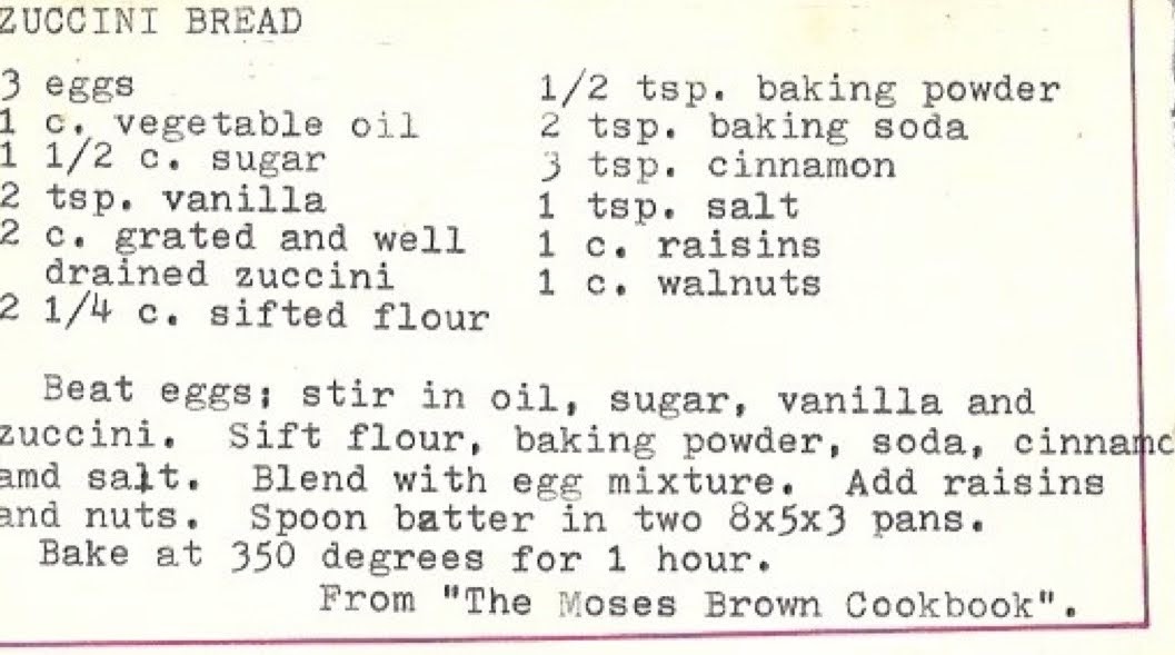 We all enjoyed the zoodles phase, and I’m sure many of us still have a spiralizer hiding somewhere in the cabinets, but I’d like to go for some more substantive options. Starting with my grandma’s “zuccini bread” recipe from The Moses Brown Cookbook. (A cookbook that I cannot find online). I think because you have to drain the zucchini for this recipe it’s a great option for your later season squashes where they start getting a little drier and starchier.