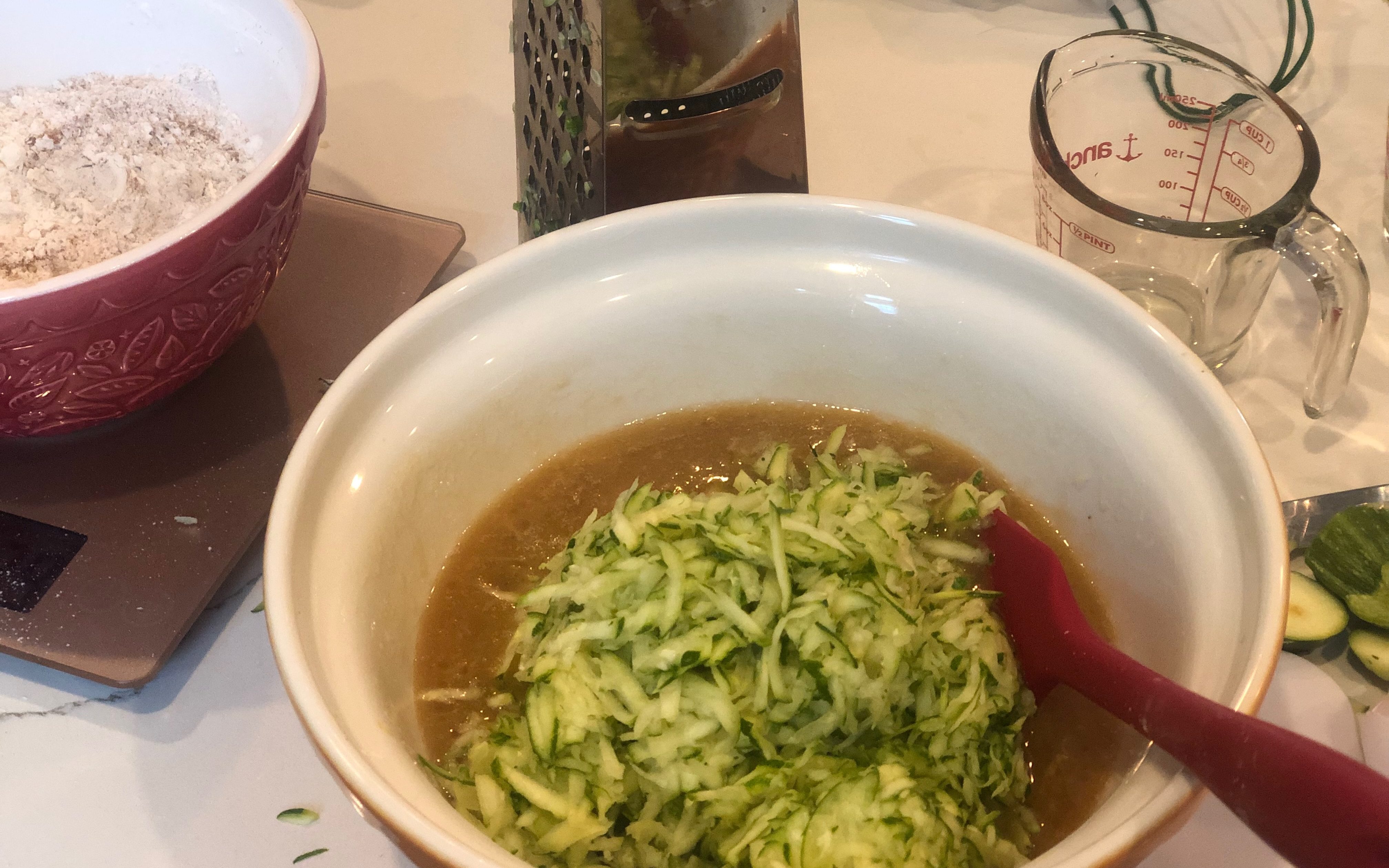 - Grate zucchini. Wrap in cheesecloth or a tea towel and squeeze out excess moisture over the sink before measuring. Set aside in a colander (in the sink) to continue to drain while you assemble the rest of the ingredients.