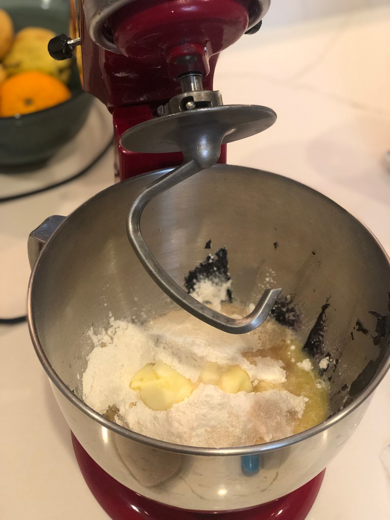 - With the dough hook (or by hand) mix at low speed until dough starts to come together and there is no more loose flour. Bring the speed to medium (or knead by hand) until dough is smooth but still tacky-when it cleans and slaps the bowl in a stand mixer.