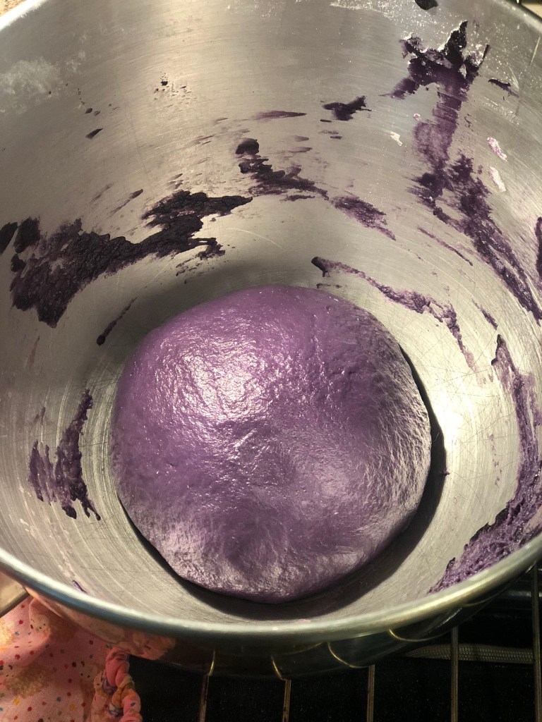 The dough recipe is based on King Arthur’s Perfectly Pillowy Cinnamon Rolls, which actually uses a tangzhong that is a higher proportion of milk than the traditional 1:1 milk to flour ratio. To add ube to the rolls I used ube sweetened condensed milk in the tangzhong. I’m not 100% on the science but I think the starchiness of the ube is offset by the sugars in the condensed milk. I get my ube condensed milk at HMart, if you can’t find it in a grocery store near you you can order it online. It’s on amazon where it apparently comes with a spoon. For the icing the amount of sweetened condensed milk I used was just the amount I had left in the can from a different recipe so if you want more icing feel free to use the whole can. You can also throw in a little bit of the ube condensed milk to make it a light purple.