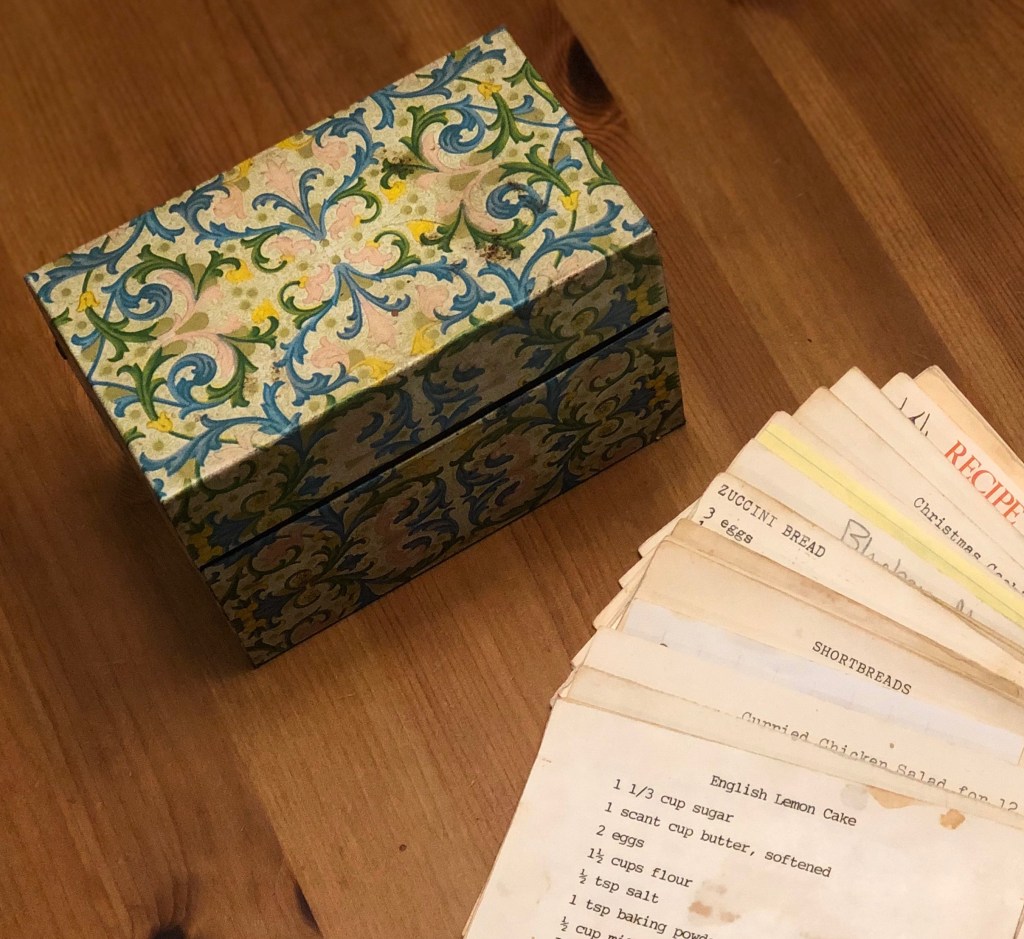 I think all grandmothers had the tin of recipes full of index cards in the kitchen. Grandma Conard’s box of recipes is full of oleo, difficult to read handwriting and sparse instructions. We’ll try them out and see what happens!